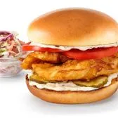 Reel in the flavor of hand-battered, golden-fried cod topped with pickles, tartar sauce and tomato with coleslaw on the side.