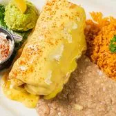 chicken enchilada with crema verde sauce, cheese enchilada con queso and beef enchilada con carne. served with rice, beans, crispy beef taco and tamale