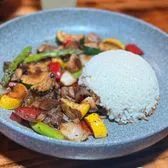 Vegetarian medley of zucchini, squash, red bell, mushroom, garlic, and asparagus sautéed in a soy sauce reduction. Served with a side of white rice.