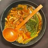 A beef pho broth with udon noodles, pork belly, kimchi, green onion, bok choy, and togarashi