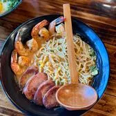 Red curry broth with gulf shrimp, roasted corn, green onion, and sausage Over soba noodles.