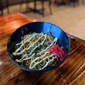 Vegetarian stir fry noodles with cabbage, carrots, green onion, mushroom, and yakisoba sauce. Topped with pickled shoga ginger, kewpie, and furikake.