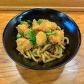 A drunken Udon noodle in a ground beef sauce topped with panko fried chicken thighs and garnished with green onions.