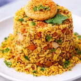 A popular Indian street food made with puffed rice, crisp vegetables, tangy tamarind chutney, and aromatic spices. This vibrant, crunchy snack offers a delightful blend of textures and flavors, making it a refreshing and zesty treat.