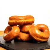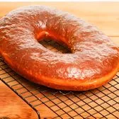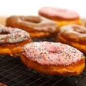 Glazed donut topped with sweet strawberry icing and rainbow sprinkles.