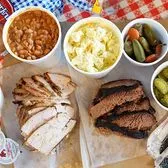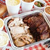 A total of 3 pounds of sliced meat split between two meat options Note: There is an additional charge for Moist Brisket 1½ quarts of each of the two side options If Deluxe Meats are added, you will receive the following: Pork Ribs – seven ribs for an additional charge. Chicken – whole chicken for an additional charge. If Dessert is added, you will receive your choice of the following for an additional charge: Peach Cobbler – 1½ quarts Puddings and Krispies Treats – individual portions