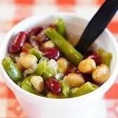 A mixture of green, kidney and Garbanzo beans in a sweet relish dressing.