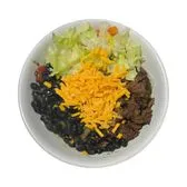 Proteína, caraotas, lechuga, arroz, tomate y queso amarillo. (Your choice of meat: Black beans, lettuce, rice, tomato & yellow shredded cheese.)