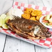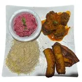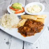 Aguacate, caraotas, plátanos, arroz y tomate. (Avocado, black beans, plantains, rice & tomatoes.)