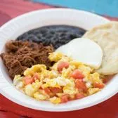 Una arepa, caraotas, cebollas, huevos, cazón, tomate, queso guayanés y queso rallado. (An arepa, black beans, grated cheese, onions, scrambled eggs, shark, tomato & white Venezuelan cheese.)