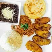 Una arepa, arroz, caraotas, mechada, plátanos y queso rallado. (An arepa, black beans, grated cheese, plantains, rice, and shredded beef.)