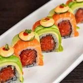 spicy tuna wrapped in soy paper topped with escolar, avocado and wasabi tobiko