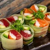 blue fin, fresh salmon, shrimp and avocado without rice wrapped in cucumber topped with truffle vinaigrette, onions, tobiko, wasabi tobiko and green onions