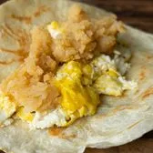 Buttery flour tortilla, dreamy eggs, and honey pepper-mustard marinated chicken.