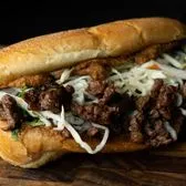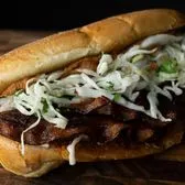 Fresh baked French boulle bread filled with succulent grilled flank steak, refried beans, pickled cabbage, onion, and cilantro.