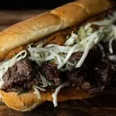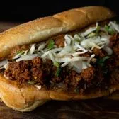 Fresh baked French boulle bread filled with slowly braised beef with herbs, refried beans, pickled cabbage, onion, and cilantro.