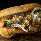 Fresh baked French boulle bread filled with honey pepper-mustard marinated chicken, refried beans, pickled cabbage, onion, and cilantro.