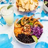 Mixed leaf lettuce with Gulf shrimp, avocado slices, pico de gallo, tortilla strips GF