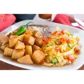 Scrambled eggs, corn tostadas, serranos, tomatoes, onions, and topped with cheese. Served with refried beans, breakfast potatoes, and homemade flour tortillas.