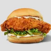 Antibiotic-free, hand-breaded, white-meat chicken breast over lettuce, pickles, and buttermilk herb mayo on a toasted potato bun (Contains: Milk, Egg, Wheat, Sesame)