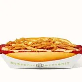 100% Vienna® Beef hot dog topped with melted cheddar and American cheese and crispy onions on a toasted potato bun. (Contains: Milk, Wheat, Sesame)
