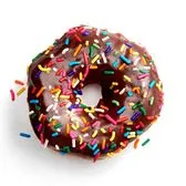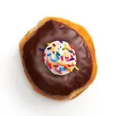 A classic yeast donut iced by hand with rich chocolate and showered with rainbow sprinkles.
