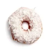 A delicious Shipley donut decorated by hand with classic vanilla icing and a heaping helping of coconut shavings.