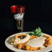 Breaded and fried beef cutlet topped with gravy, comes with two sides, Texas toast and a beverage
