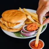 Grilled chicken breast on toasted bun with lettuce, tomato, pickles, onion, mayonnaise comes with fries