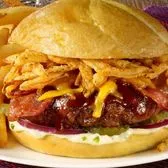 Our flame grilled beef patty, topped with hickory sauce, mayo, cheese, bacon, pickle and fried onion rings. Comes with fries