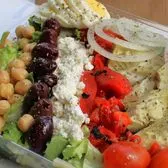 Artichoke Hearts, Garbanzo Beans, Roasted Red Peppers & Feta Cheese, w/ Kalamata Olives, Pepperoncini, Onion, Grape Tomatoes, Hard-Boiled Egg & Seasoning on a bed of Lettuce