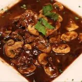 Chicken, Mushrooms in a Sweet Marsala Sauce. Dish is served with a side of pasta.