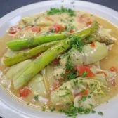 Chicken, Artichoke, Asparagus, Fresh Tomato, White Wine, Butter Sauce. Dish is served with a side of pasta.