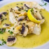 Chicken, Capers, Mushrooms, in Lemon Butter Sauce. Dish is served with a side of pasta.