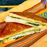 Grilled local artisan sourdough with rBGH-free Tillamook Pepper Jack cheese with nut-free cilantro pesto, baby spinach, and sliced turkey