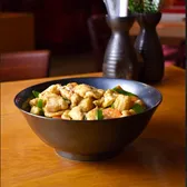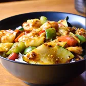 Chicken tossed with red bell pepper, zucchini, ginger, garlic, spicy chili pepper and peanuts