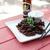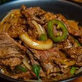 Beef loin strips tossed with green onion, red chili, jalapeno and spicy brown sauce