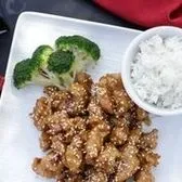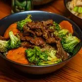 Beef loin strips tossed with broccoli, carrot, and brown sauce.