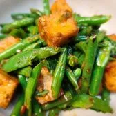 Stir-fried fresh green bean with our homemade curry paste, and shredded Kaffir lime leaf.