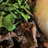Stir-fried choice of protein in garlic black pepper sauce, topped with cilantro and side of cucumber.
