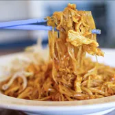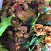 Stir-fried Flat rice noodle topped with stir-fried ground meat, celery, red onion, mushroom, curry powder and mixed soy sauce with fried garlic and cilantro. Served with green leaf lettuce and sweet & sour sauce.