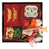 4 pieces of Nigiro-Zushi (tuna, salmon, octopus and tamago) 2 pieces of California Roll 2 pieces of Tekka Maki Rolls (tuna roll) 2 pieces of Kappa Maki Rolls (cucumber roll) 2 pieces of Futomaki Roll (shiitake mushroom, cucumber, tamago, kampyo and sakura dembu) 1 Chicken Yakitori Skewer Yakimeshi Rice w/Vegetables Miso Shiro Soup