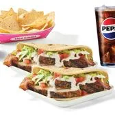 Two Steak Fajita Tacos with grilled peppers and onions, chips & queso and a 20 oz. drink.