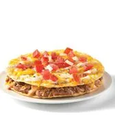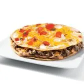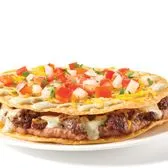 Ground Beef, refried beans, Jack & Cheddar cheeses, and chipotle ranch between 2 crispy shells, then topped with more Jack & Cheddar cheeses, sour cream and pico de gallo.