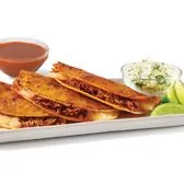 3 crispy corn tortillas filled with seasoned beef birria and melted cheese. Served with a side of savory broth, fresh onion and cilantro and limes.
