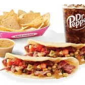 Smoky carnitas topped with cilantro, onion and green enchilada sauce on three street style corn tortillas. > Combo served with chips and queso and a small drink > Plate served with rice and choice of beans, guacamole, and your choice of tortillas