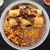Two flour tortillas filled with scrambled eggs, bacon, spicy pork, fresh jalapenos, mixed cheese, and queso. Then smothered with queso and garnished with our XXX sauce. Served with refried beans and potatoes.