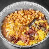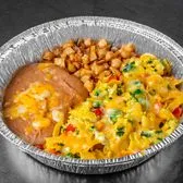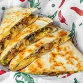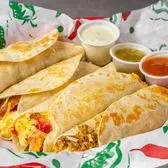 A breakfast quesadilla perfectly grilled with scrambled eggs, your choice of meat, potatoes, 5 Alarm sauce, and queso. A roundhouse kick of taste!