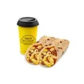 Start your day with two warm, soft flour tortillas filled with perfectly seasoned, scrambled eggs and golden, crispy potatoes, paired with a hot cup of coffee, the perfect morning pairing to kickstart your day.