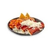 Three soft-rolled corn tortillas filled with fresh cheese, diced onion, and a hint of oregano, all smothered in a savory red pepper sauce. Served with diced carrots, potatoes, and refried beans.